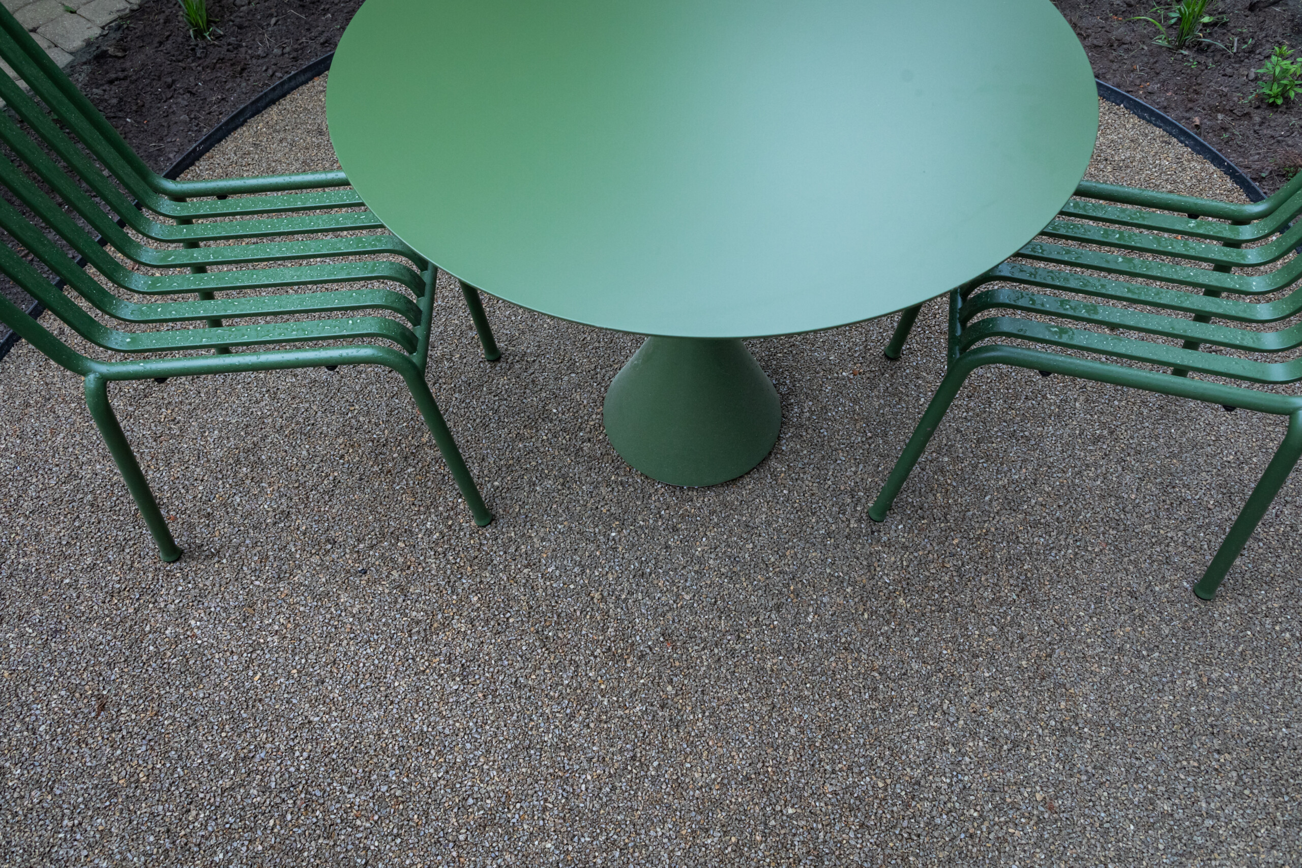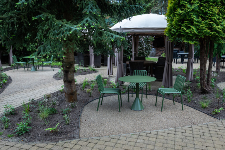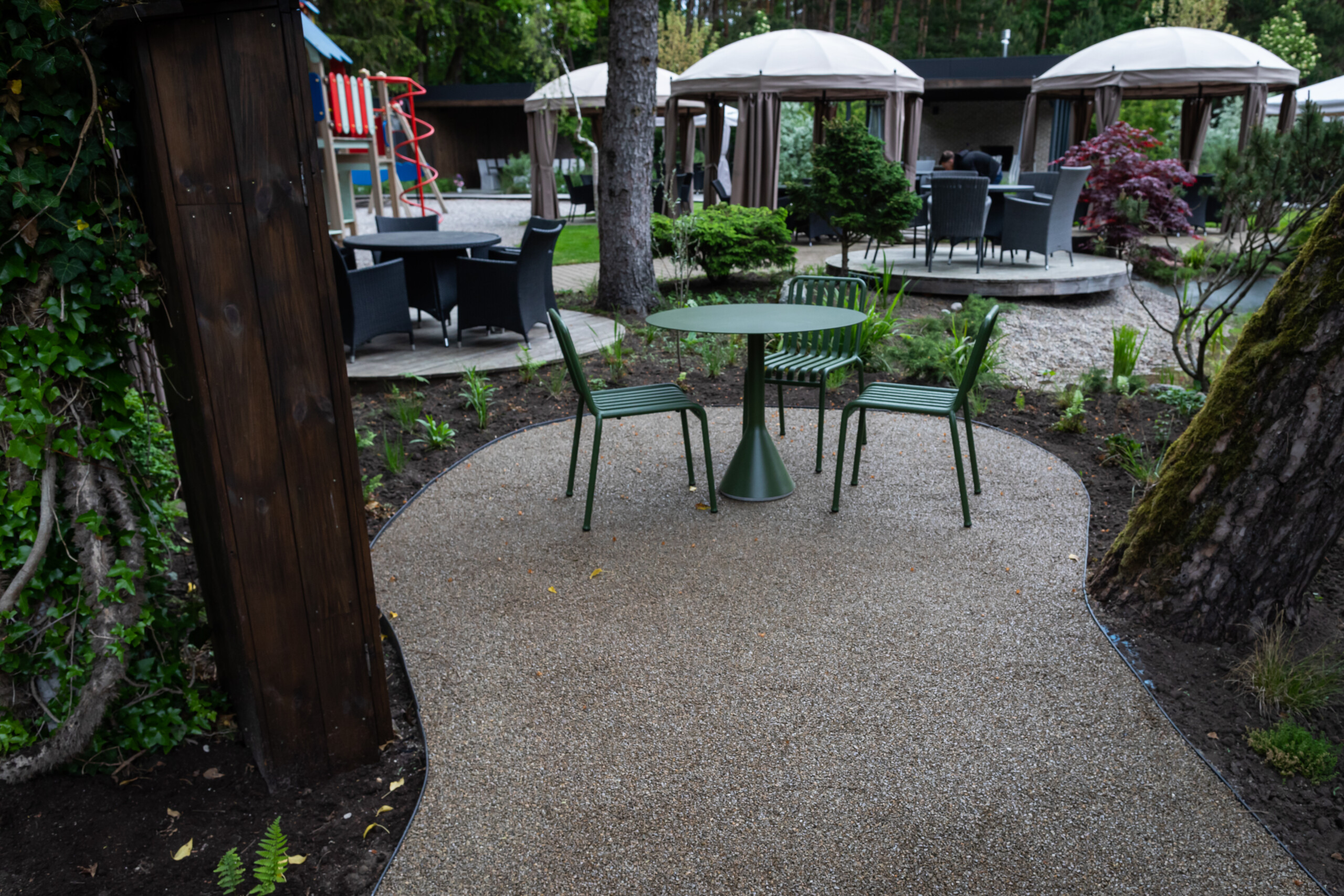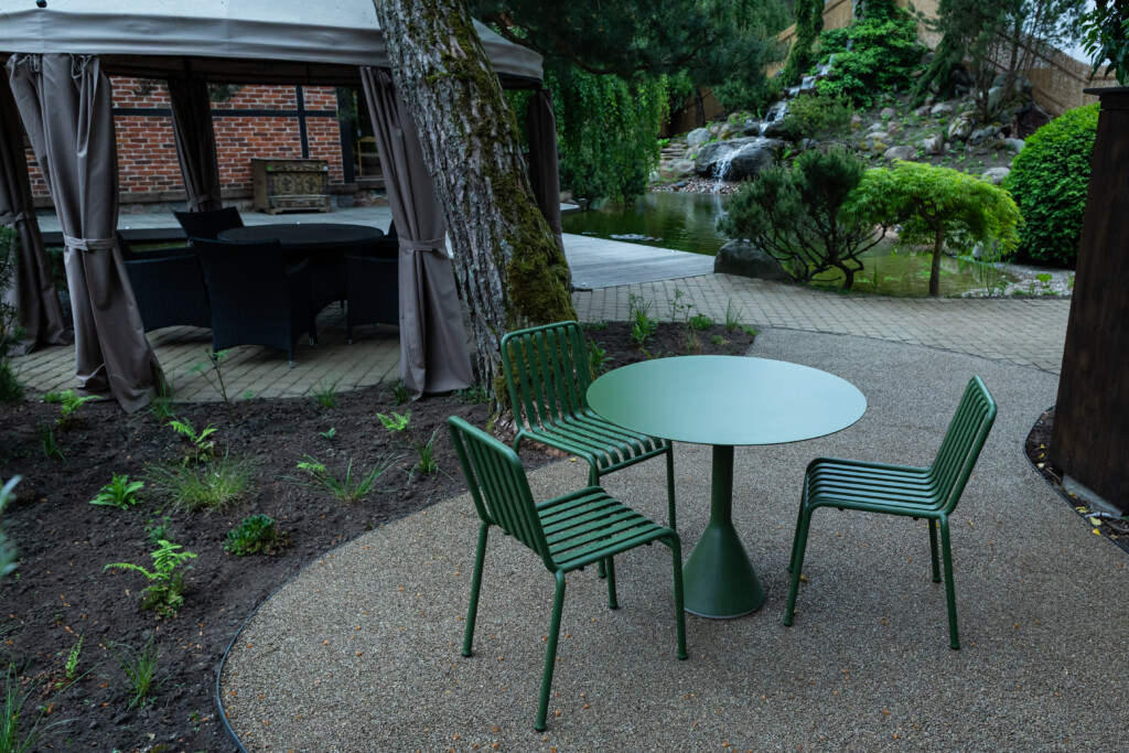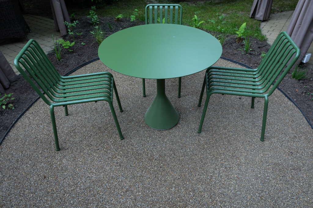 Betono mozaika esindatavate toodete valikus on saadaval murukatte/kruusa sideaine 202 Deko EP. Toode, millega kaetakse puhas ja kuiv killustik, sobib teedele, jalgrajadele, puhkealadele, basseinide ümbrusele, lillepeenardele ning ka, nagu käesolevas projektis, välikohvikute aladele.